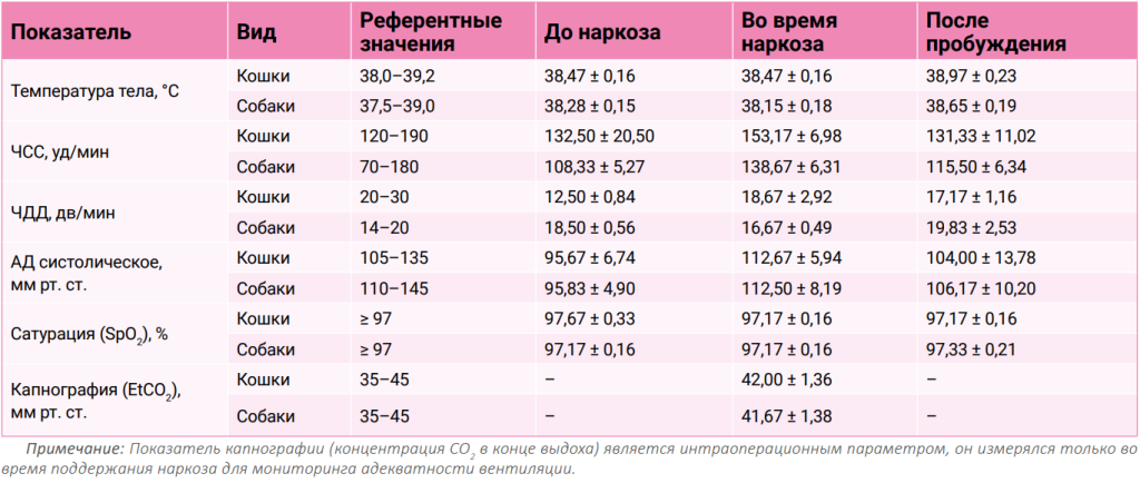 Мониторинг основных физиологических параметров не выявил статистически значимых отклонений от референтных значений ни у кошек, ни у собак на всех этапах исследования. Как видно из таблицы 1, показатели температуры тела, ЧСС, ЧДД, артериального давления, сатурации и капнографии оставались в пределах физиологической нормы. Это свидетельствует о стабильности гемодинамики и функции внешнего дыхания под действием препарата. Небольшие колебания, такие как незначительное увеличение ЧСС у собак во время наркоза, являются типичной адаптивной реакцией на ингаляционные анестетики и не расцениваются как негативный эффект.Мониторинг основных физиологических параметров не выявил статистически значимых отклонений от референтных значений ни у кошек, ни у собак на всех этапах исследования. Отмечаемое у кошек до наркоза снижение частоты дыхательных движений (ЧДД) является физиологической нормой для животных в состоянии покоя и спокойствия и, вероятно, связано с эффектом индукции препаратом «Пропофол». Как видно из таблицы 1, показатели температуры тела, ЧСС, ЧДД оставались стабильными во время анестезии.