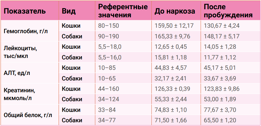 Результаты общего клинического и биохимического анализов крови, проведенных до введения в наркоз и после полного пробуждения животных, не показали клинически значимых изменений. Ключевые гематологические и биохимические параметры оставались стабильными, как показано в таблице 2.
