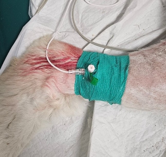 - Постановка внутривенного катетера 20G в латеральную вену сафена (фото 2Г). Для углубления анестезии был подготовлен пропофол («Пропофол Каби», 1%, Fresenius Kabi, Германия), однако у данного пациента его использование не потребовалось.