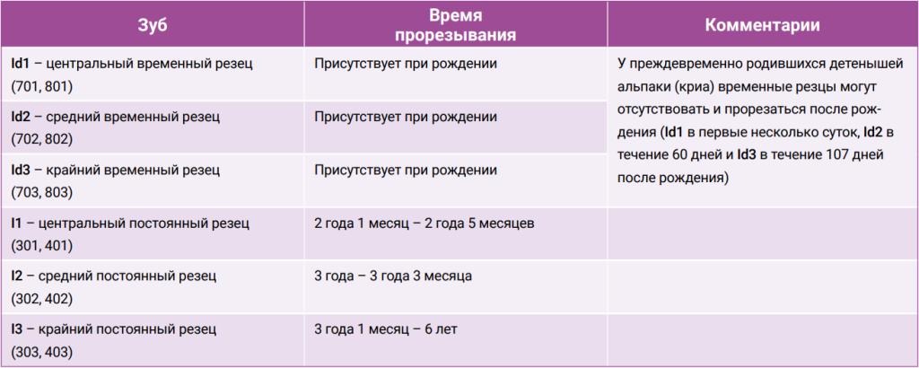 Персистирующие временные зубы – это зубы, которые не выпали в установленные для данного вида животных сроки (табл. 1). У альпак смена резцов обычно завершается примерно к шести годам3. Зачатки постоянных зубов располагаются непосредственно под временными, и по мере их прорезывания временные зубы выталкиваются и выпадают. Однако, если зачаток постоянного зуба расположен в другой позиции, может произойти задержка выпадения временных зубов, что приводит к формированию второго ряда резцов, обычно расположенного ростральнее постоянных. Проблемы с выпадением временных зубов у альпак встречаются сравнительно редко и, по оценкам некоторых авторов, составляют около 0,8% всех патологий зубов лам и альпак4. Причины нарушения смены резцов у альпак недостаточно изучены, предполагается наличие генетического компонента. В связи с этим представляется целесообразным выведение животных с подобными проблемами из разведения (Токунова М. В., ветеринарный врач Московского зоопарка, личная коммуникация).При наличии невыпавших временных резцов, помимо снижения экспозиционности, у животного могут развиться патологии прикуса, требующие более частых коррекций коронок, и воспаление тканей, окружающих зубы. Персистирующие временные зубы должны быть удалены в разумные сроки (обычно в возрасте после окончания смены зубов, реже – по факту обнаружения второго ряда зубов). Однако некоторые авторы считают, что при отсутствии нарушения стирания резцов и проблем с приемом пищи до наступления возраста полной смены зубов наличие невыпавших временных зубов может рассматриваться как косметическая проблема, не требующая вмешательства1,5.