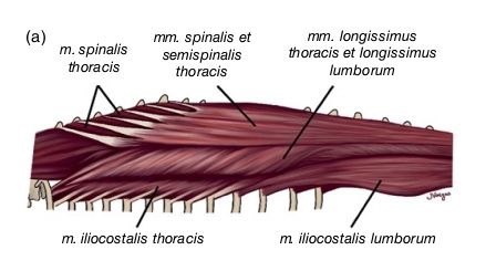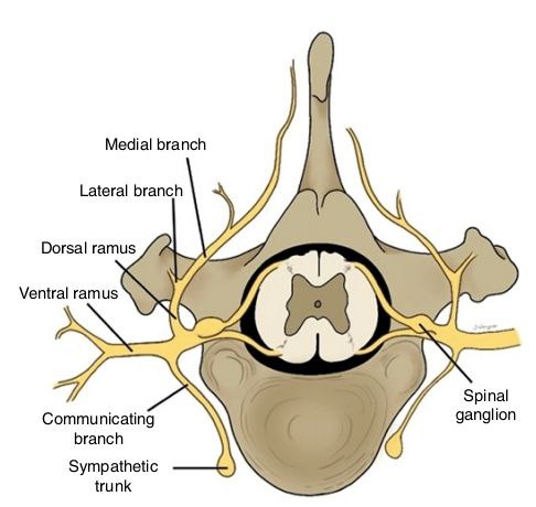 Дорсальная ветвь спинномозгового нерва делится на две основные части: медиальную и латеральную. Медиальная ветвь обеспечивает иннервацию эпаксиальной мускулатуры, а также участвует в иннервации позвонков, связок и твердой мозговой оболочки. Латеральная ветвь выходит за пределы эпаксиальной мускулатуры и делится на несколько ветвей, которые иннервируют подвздошно-реберную мышцу (m. iliocostalis thoracis) и кожу дорсолатеральной области грудопоясничного отдела позвоночника (рис. 2, 3)2.