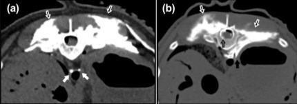 В исследовании были задействованы одна кошка в возрасте 1 год и 5 месяцев, а также два свежих трупа – кошки и собаки породы метис. Всем биологическим моделям со средней массой тела 4 ± 0,5 кг, без травм грудной клетки и с индексами кондиции тела 5–6/9 была проведена ESP-блокада с использованием УЗ-навигации, после чего проводилась компьютерная томография (КТ) для оценки распределения контрастного препарата в межфасциальном, паравертебральном и эпидуральном пространствах. Исследование было проведено с согласия владельцев всех животных. Гибель двух животных не была связана с необходимостью проведения исследования и была опосредована другими причинами. Проведение исследования не повлияло на состояние здоровья живого животного: осложнений после анестезии, КТ и введения контрастного препарата в межфасциальное пространство в процессе длительного периода наблюдения не выявлено.КТ проводил и оценивал врач визуальной диагностики (модель компьютерного томографа Philips MX16). Для ультразвуковой навигации использовался аппарат УЗИ (SonoScape ST-190), оснащенный линейным датчиком с частотой 7,5 МГц.