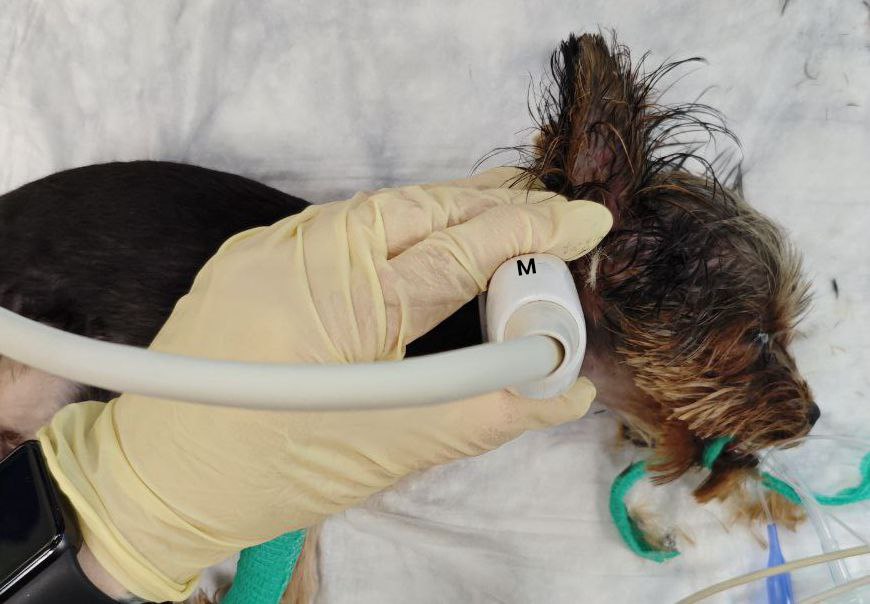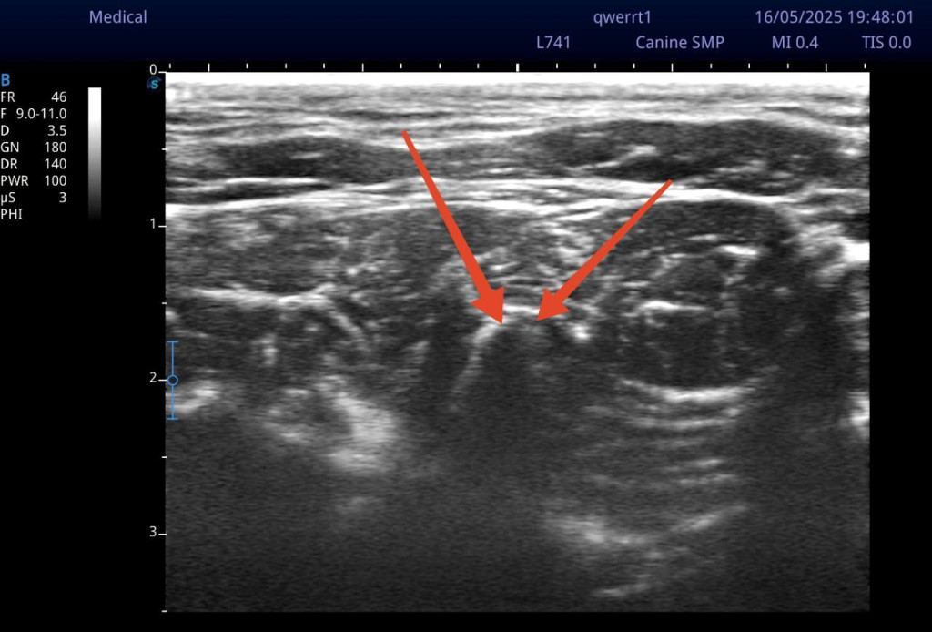 Для выполнения данной хирургической манипуляции, помимо общей анестезии, индуцированной пропофолом и поддерживаемой ингаляционной анестезией с помощью изофлурана, была проведена блокада лестничной мышцы под контролем УЗИ (видео 2). Техника выполнения блокады лестничной мышцы схожа с методикой блокады длинной мышцы головы за исключением необходимости идентифицировать четвертый шейный позвонок с краниальной его части, при этом целевой точкой будет вентральный бугорок поперечного отростка С4. Он визуализируется как акустическая тень от кортикального слоя вентрального бугорка, направленная перпендикулярно к поверхности сканирования. Над бугорком определяется структура, напоминающая «шапочку», которая является лестничной мышцей.
