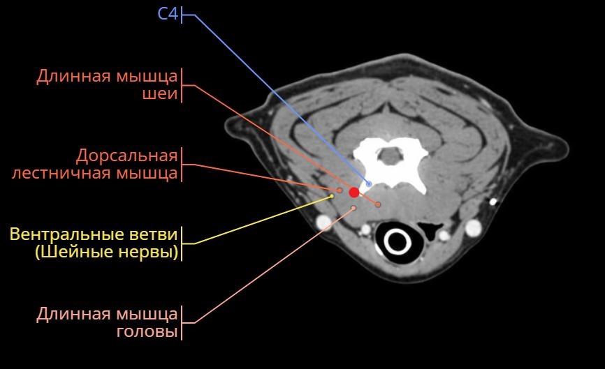 При анатомическом исследовании с окрашиванием нервных структур посредством проведения глубоких фасциальных инъекций для оценки распространения анестетика было выявлено, что прилегающая к поперечным отросткам длинная мышца головы (m. longus capitis) на уровне С3 (рядом с которой проходят спинномозговые нервы [СМН] С2-С3) начинает смещаться вентромедиально, и в области дорсального бугорка поперечного отростка третьего шейного позвонка (рис. 2) прикрепляется лестничная мышца (m. scalenus), к которой с дорсальной стороны подходит СМН С4. Далее нервы проходят поперечно по латеральной поверхности плечепоперечной мышцы (m. omotransversarius) и отдают кожные ветви от основных стволов, после чего направляются дорсально (рис. 3).