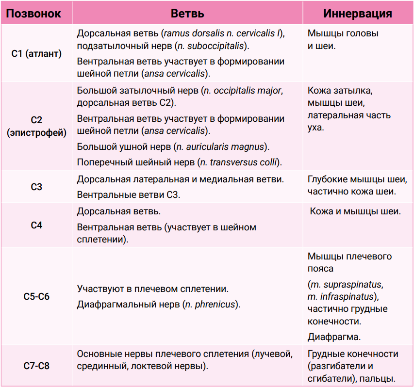 Шейный отдел позвоночного столба играет ключевую роль в обеспечении иннервации структур головы, шеи и передних конечностей. Нервные структуры, ответственные за эту иннервацию, включают шейное и плечевое сплетения.