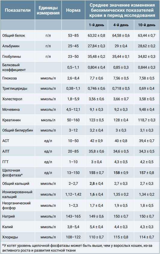 Для выявления последствий действия препарата на организм испытуемых был проведен забор крови из вены на 1, 4 и 10-й дни исследований с целью проведения биохимического анализа крови по показателям: общий белок, альбумин, глобулин, индекс альбумин/глобулин, креатинин, мочевина, глюкоза, АЛТ, АСТ, щелочная фосфатаза, холестерин, триглицериды, фосфор, ГГТ, общий билирубин и электролиты.