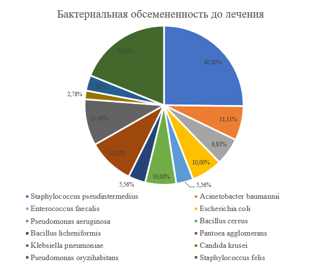 Для проведения исследования было отобрано более 130 животных с офтальмопатологиями, такими как острые и хронические конъюнктивиты, кератиты, кератоконъюнктивиты, язвы роговицы, блефариты, травмы глаза, септические иридоциклиты. Всем животным до и после лечения препаратом ОФТАЛЬМИКА® капли глазные проводилось комплексное офтальмологическое обследование, а также осуществлялся забор образцов для бактериологического посева и ПЦР-диагностики.У всех животных была отмечена клиническая эффективность препарата, проявляющаяся в полном исчезновении клинических симптомов заболевания (рис. 3-5). Анализ динамики бактериальной обсемененности показал достоверное снижение или полное исчезновение данных показателей у животных экспериментальных групп. В ходе исследования не было выявлено роста патологической флоры после применения препарата ОФТАЛЬМИКА® капли глазные (рис. 6).