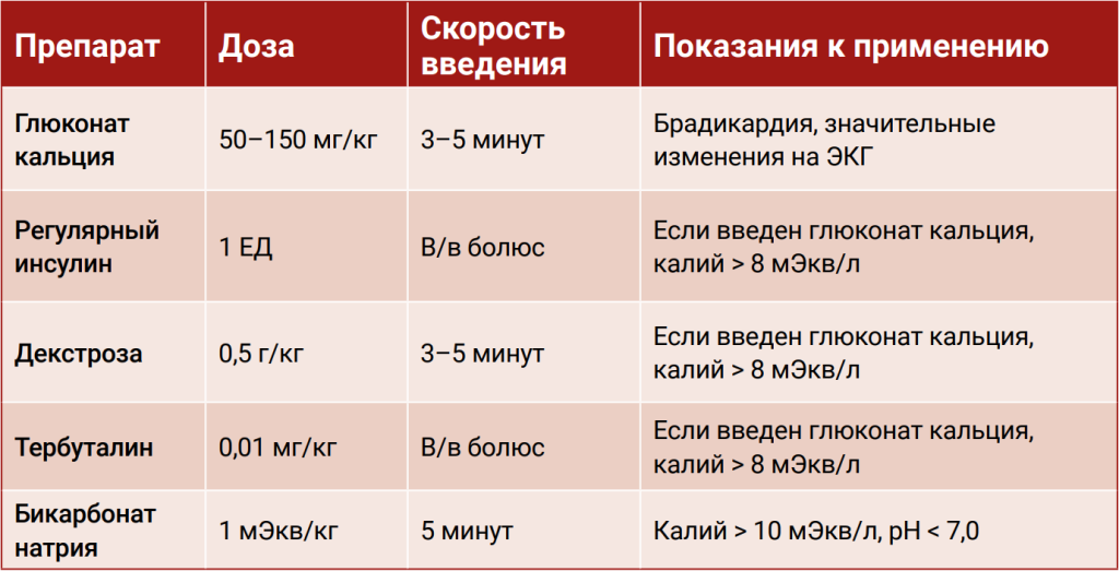 Если у пациента наблюдаются ЭКГ-признаки гиперкалиемии, рекомендуется немедленное вмешательство, а именно: медленное внутривенное (в течение 1–2 минут) введение кальция глюконата в дозе 100–150 мг/кг. Кардиопротективный эффект от введения кальция глюконата длится около 40–60 минут. При необходимости болюс можно повторить.