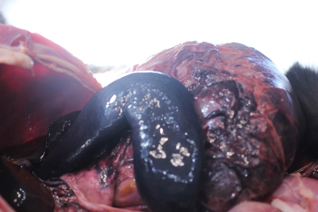 При гистологическом исследовании выявлены выраженные аутолитические изменения стенок желудка и селезенки. В стенке желудка обнаружены крупные очаги некроза, субтотальный некроз слизистой оболочки, в сохраненных участках отмечался отек подслизистого слоя. В селезенке наблюдалось значительное кровенаполнение красной пульпы с образованием плотных пластов эритроцитов, большая часть которых подверглась лизису. Белая пульпа была слабо различима.