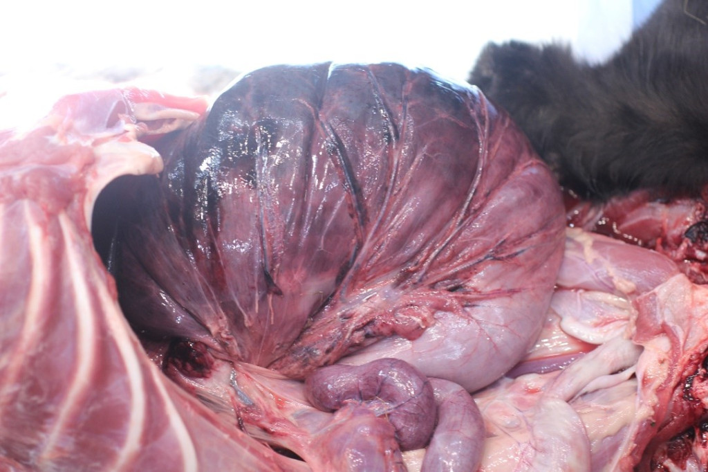 Патологоанатомическое вскрытие было проведено через 12 часов после гибели животного. Труп хранился при температуре +4 °C, заморозка не проводилась.При осмотре брюшной полости обнаружено ее значительное увеличение в объеме, при перкуссии определялся тимпанический звук. Желудок был увеличен в объеме и занимал большую часть брюшной полости. Большая кривизна желудка обращена к правой брюшной стенке. Желудок перекручен по короткой оси на 180° и по длинной оси на 180° (фото 2Б, В). Серозная оболочка бордово-фиолетового цвета, целостность стенки желудка не нарушена.