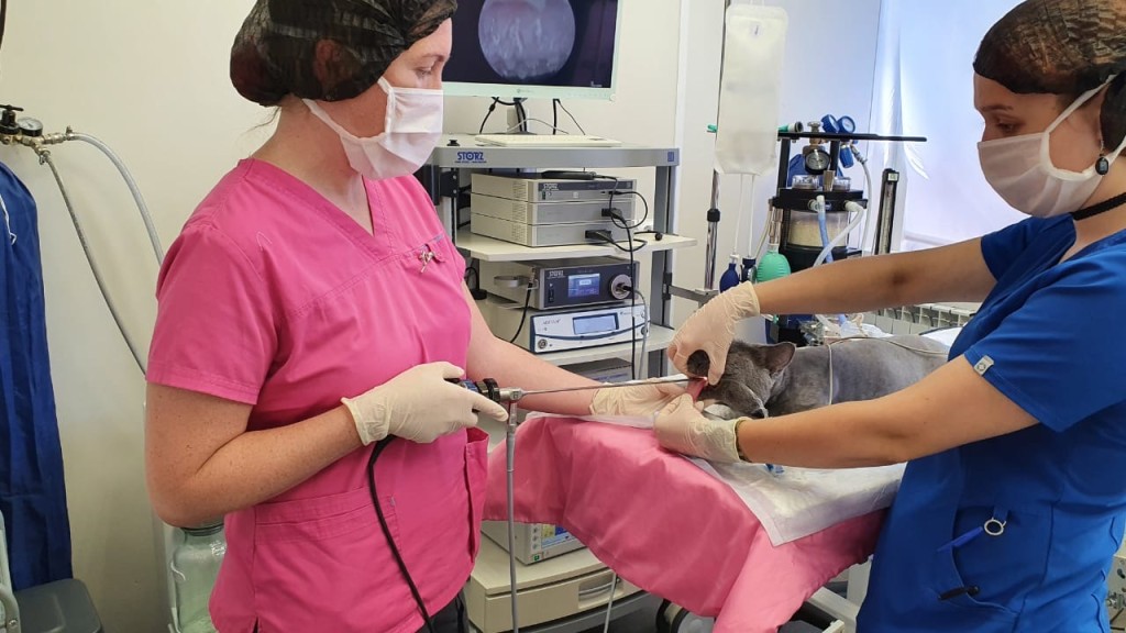 У всех пациентов в процессе осмотра наблюдался выраженный врожденный стеноз ноздрей (видео 1–4). Важными клиническими признаками, при наличии которых можно подозревать ДНФК, являются стертор и стридор. Кошки не всегда демонстрируют их на приеме, поэтому очень важно тщательно собирать анамнез, и, возможно, полезным для этого будет демонстрация владельцам видеозаписей животных с похожими симптомами.Также у всех кошек отмечалась инспираторная одышка, сопровождающаяся сопением, стертором и иногда стридором на глубоком вдохе. У двух пациентов возникали эпизоды дыхания через рот. Степень выраженности симптомов на приеме может сильно варьироваться, что, вероятно, зависит от темперамента кошки и реакции ее на стресс при посещении клиники.