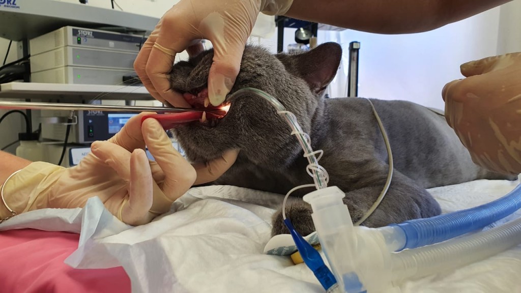 Видео 8. Ларингоскопия кота под номером 4 после резекции мягкого нёба.