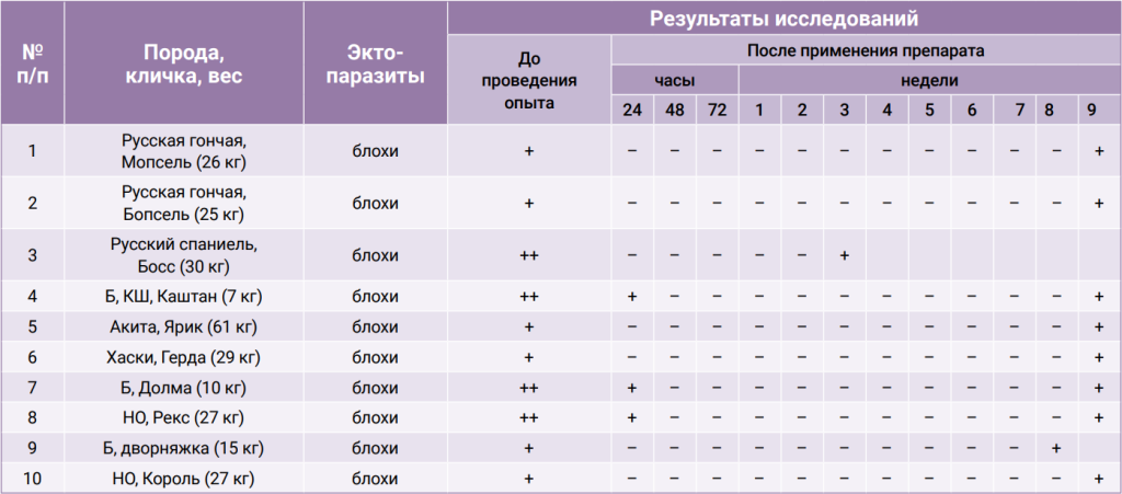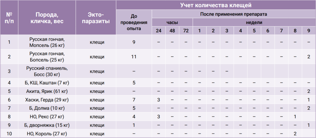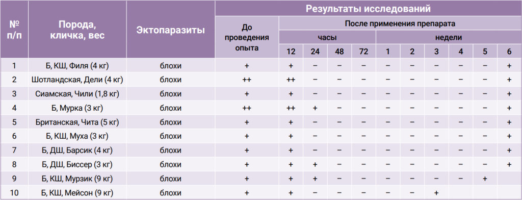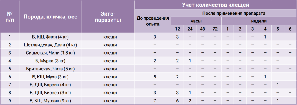 Оценка эффективности включала снижение числа насекомых и клещей, элиминацию живых членистоногих на основании их подсчета, а также исчезновение клинических признаков. Результатом успешного лечения считали отсутствие живых паразитов (блох и иксодовых клещей).