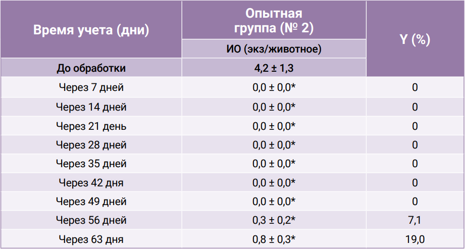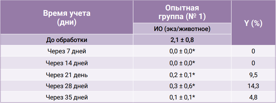 При оценке акарицидной эффективности препарата определяли индекс обилия (ИО) – количество иксодовых клещей у одного животного в среднем по группе.