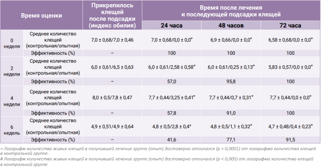 Через 6 недель после дачи препарата у собак опытной группы количество клещей спустя 24, 48 и 72 часа после их подсадки было достоверно ниже (p < 0,005), чем у собак контрольной группы.