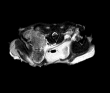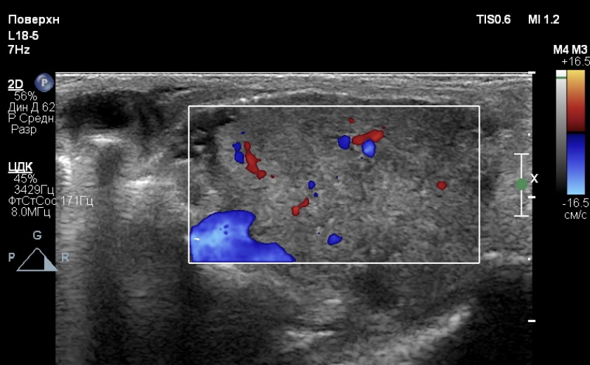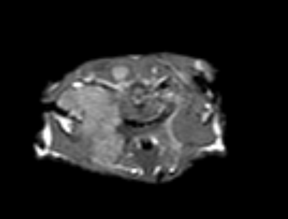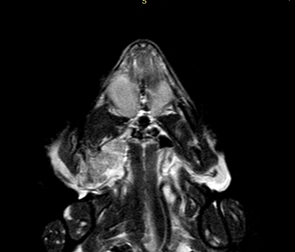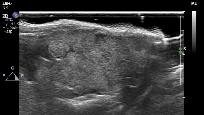Животному были выполнены ультразвуковое исследование мягких тканей шеи, магнитно-резонансная томография области головы и шеи с контрастным усилением.Результаты УЗИ. В просвете ротоглотки было выявлено гетерогенное, преимущественно изоэхогенное образование с гипоэхогенными включениями неправильной формы, нечеткими контурами, размерами 15×16 мм (фото 2, 3).