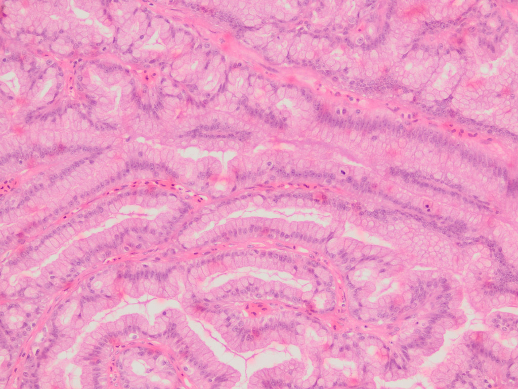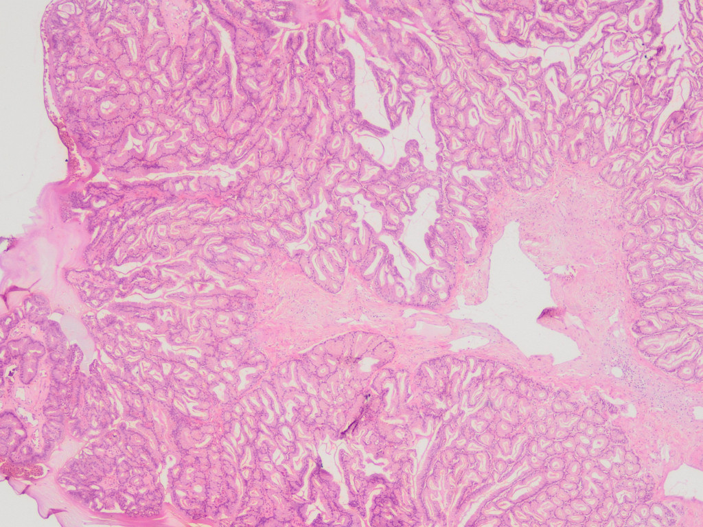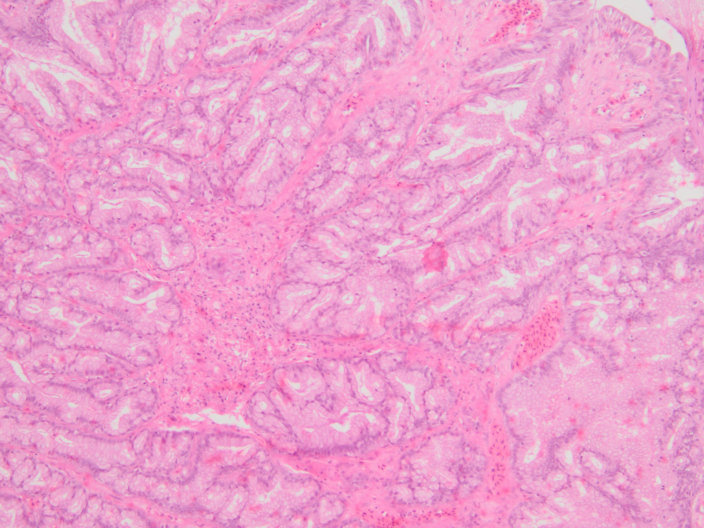 Морфологический диагноз: новообразование – карцинома слюнной железы, преимущественно папиллярного типа, низкая степень атипии и количества митозов, выраженная секреторная активность.
