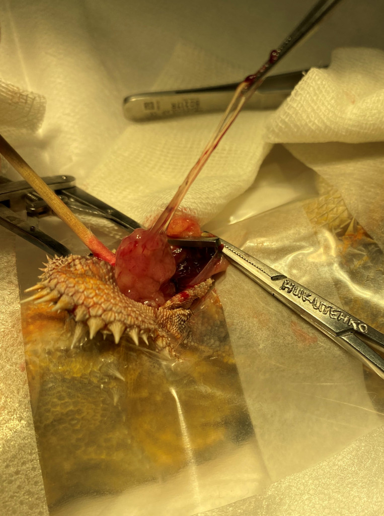 Через 7 дней после первичного приема животное было предоставлено в клинику для хирургического удаления объемного образования.Для проведения анестезии использовался кетамин 15 мг/кг (кетамин 50 мг/мл, «ФГУП Московский эндокринный завод», Москва, РФ), инъецированный внутримышечно в передние конечности, и фентанил 10 мкг/кг (фентанил 50 мкг/мл, «ФГУП Московский эндокринный завод», Москва, РФ), инъецированный внутримышечно в передние конечности.