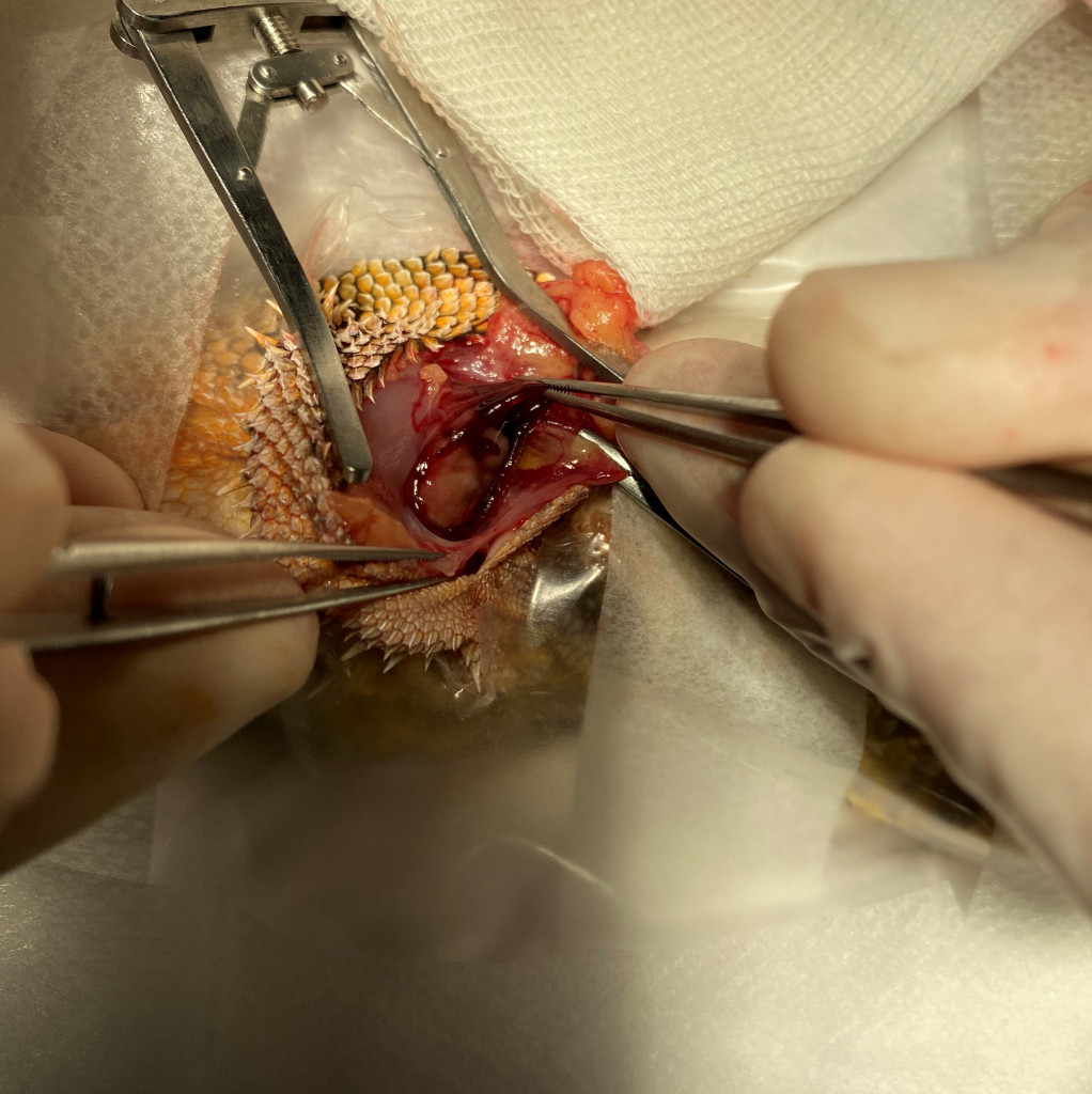 Опухоли слюнных желез – нечасто встречающаяся группа неоплазий у рептилий и, в частности, у бородатых агам. Особенности течения карцином слюнных желез, детали хирургической техники и клинических исходов у бородатых агам не описаны.Бородатая агама (Pogona vitticeps) поступила с жалобами владельцев на плохой аппетит, увеличение в объеме правого глаза, припухлость в области шеи справа. Были проведены физикальный осмотр, магнитно-резонансная томография, УЗИ, гистологическое исследование неоплазии ротовой полости. Образование было удалено хирургически. Ранний послеоперационный период протекал без особенностей, спустя 11 дней после хирургического вмешательства животное пало.