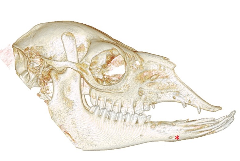 Подбородочное отверстие располагается примерно на 2–3 см каудальнее мандибулярных резцов (фото 3). Отверстие лоцируется с помощью пальца со стороны ротовой полости на лабиальной поверхности нижней челюсти. После вкола иглы проводится аспирационная проба и вводится местный анестетик. Описаны 2 варианта введения: непосредственно в канал или в месте выхода нерва в области подбородочного отверстия. После проведения блока обеспечивается анальгезия тканей ростральнее места инъекции1.Диагностика и лечение