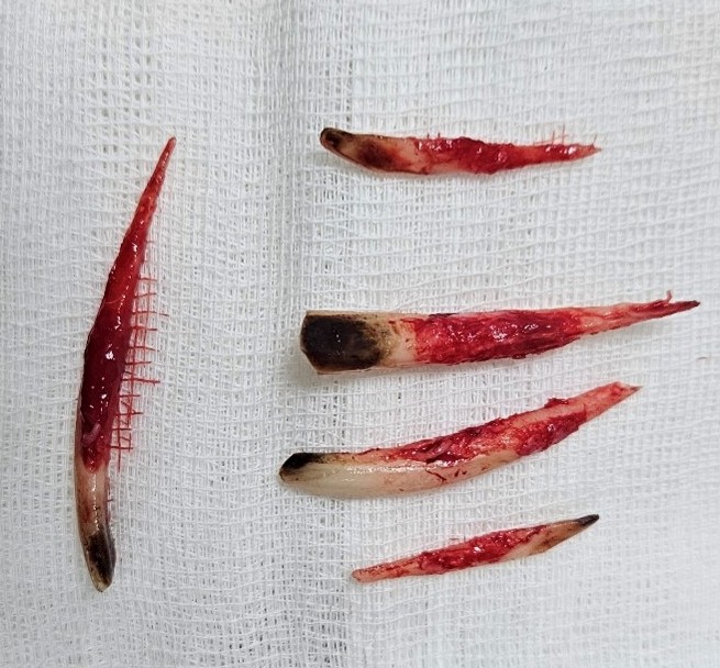 После введения в анестезию альпаке провели внутриротовое рентгенологическое исследование (фото 4A) и компьютерную томографию черепа (фото 3 и 4Б). В результате анализа полученных данных не было выявлено признаков воспалительного процесса в области корней зубов. Для оценки состояния мандибулярных резцов наиболее информативной является внутриротовая вентродорсальная проекция. Временные резцы альпаки имеют лопатовидную или шпателевидную форму, тогда как постоянные резцы характеризуются долотообразной формой2.Экстракция временных резцов проводилась в положении пациента лежа на правом боку для профилактики тимпании. Для процедуры использовались инструменты: люксаторы размеров 1 и 2 (рабочие части 2 и 3 мм соответственно), элеватор 2,5 мм и универсальные щипцы для экстракции зубов. Техника экстракции соответствовала общепринятым методам, применяемым при удалении зубов у собак и кошек.