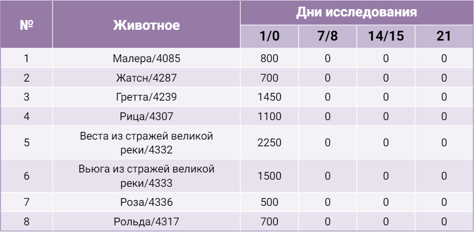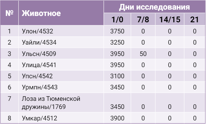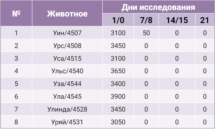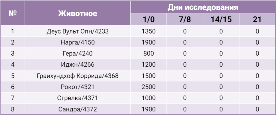 Уже с 7/8-го дня ни у одной собаки не было обнаружено яиц гельминтов (количество яиц в обеих группах – 0), эффективность препаратов составила 100%.