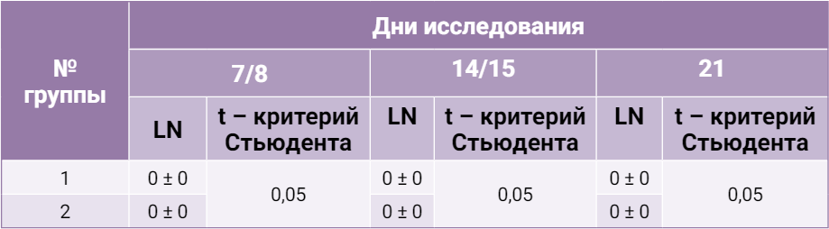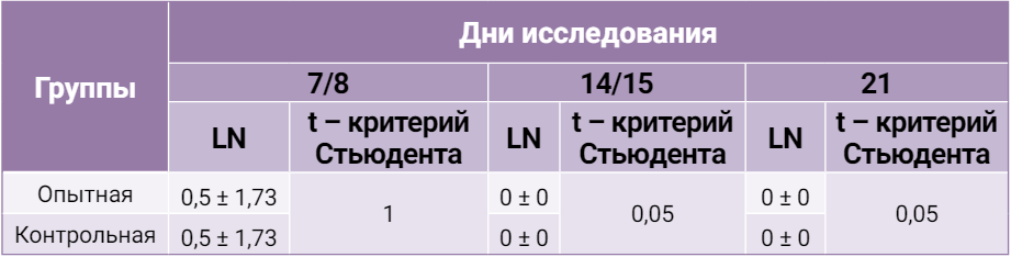 В каждой группе животных t – критерий Стьюдента на 7/8-й, 14/15-й и 21-й дни составил 0,05 (табл. 8).