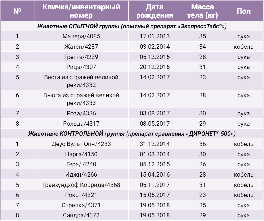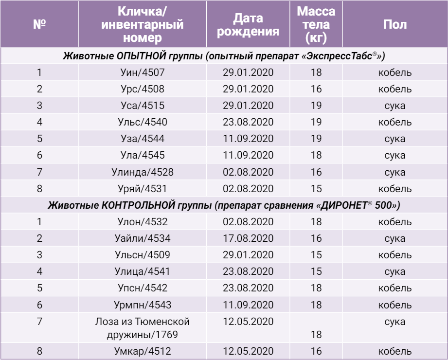 Исследования выполнялись согласно Приказу Министерства сельского хозяйства РФ от 6 марта 2018 г. № 101 «Об утверждении правил проведения доклинического исследования лекарственного средства для ветеринарного применения, клинического исследования лекарственного препарата для ветеринарного применения, исследования биоэквивалентности лекарственного препарата для ветеринарного применения».Исследования проводились на спонтанно зараженных собаках, которых по принципу аналогов с учетом возраста и массы тела распределяли в группы по 8 животных в каждой. Собакам опытной группы задавали исследуемый препарат «ЭкспрессТабс®», собакам контрольной группы задавали препарат сравнения «ДИРОНЕТ® 500» – таблетки для собак средних пород.