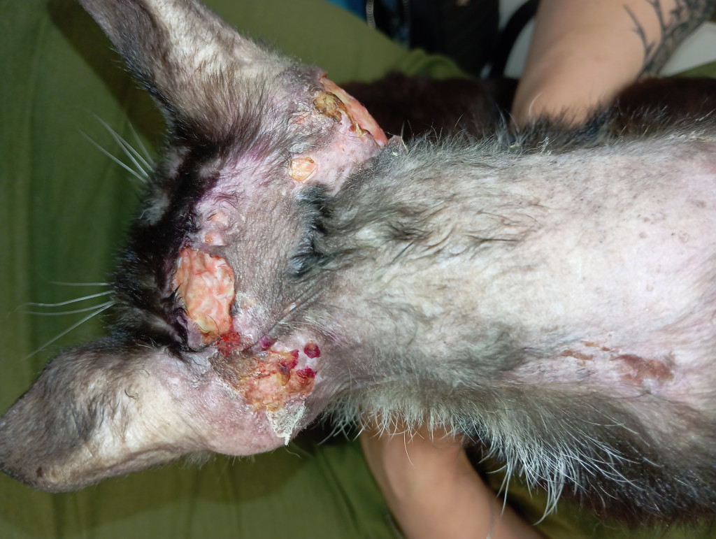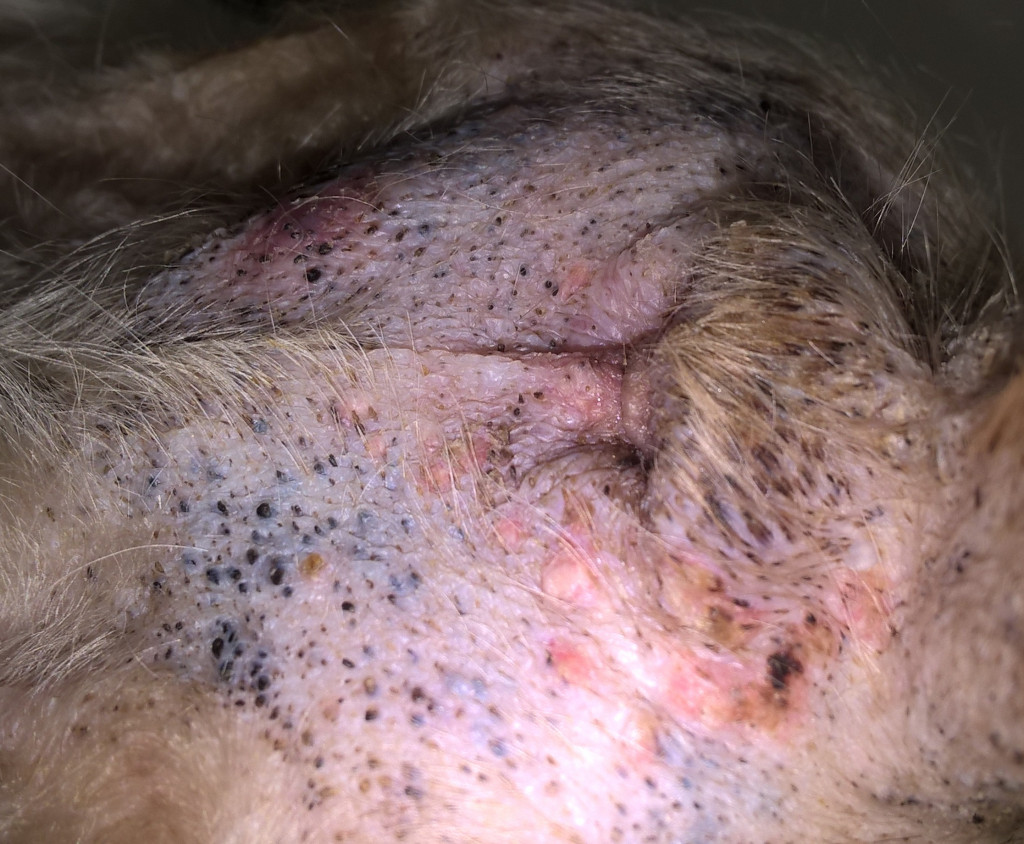 Наиболее частым побочным эффектом местных кортикостероидов, описанным в медицине человека, является атрофия кожи6. Она развивается вследствие подавления кортикостероидами пролиферативной активности кератиноцитов и дермальных фибробластов, а также снижения синтеза коллагена и других белков внеклеточного матрикса19. Подобные эффекты также характерны для собак и кошек10. Кожа выглядит тонкой и хрупкой (рис. 1-3, 5), поражаются эпидермис и дерма, легко возникают трещины и даже разрывы. Кроме того, нарушение кератинизации и истончение рогового слоя приводят к повышенной его проницаемости и, как следствие, к увеличению трансэпидермальной потери воды19,20, что, в свою очередь, становится причиной излишней сухости кожи и развития как сухой или жирной себореи.