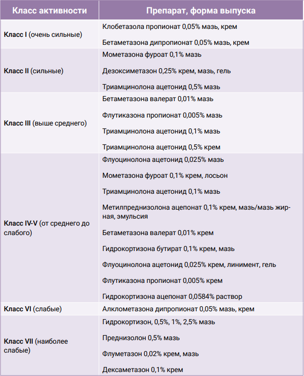 В Северной Америке топикальные глюкокортикоиды делятся на классы в зависимости от их способности вызывать вазоконстрикцию (сужение капилляров и, как следствие, побледнение кожи у здорового человека)6,9. К классу I относятся местные кортикостероиды с максимальной активностью (клобетазол, бетаметазон), класс VII включает наиболее слабые препараты (дексаметазон, гидрокортизон)10 (табл. 1). Основная молекула гидрокортизона и ее синтетические аналоги модифицируются путем галогенирования, метилирования, ацетилирования, этерификации и/или индукции двойной связи в целях усиления терапевтического эффекта и снижения побочных действий. Таким образом, для оценки уровня эффективности выбранного препарата необходимо знать, в виде какого соединения в нем присутствует кортикостероид.