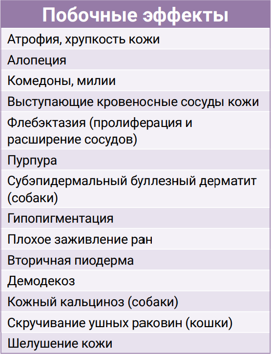 Риски возникновения нежелательных эффектов от применения местных ГКС возрастают при использовании сильнодействующих препаратов, а также при увеличении площади нанесения лекарственного средства. Следует также учитывать вероятность слизывания животным лекарства; при попадании внутрь большинство препаратов, содержащих кортикостероиды, будут оказывать такой же системный эффект, как и при применении подобных средств перорально.