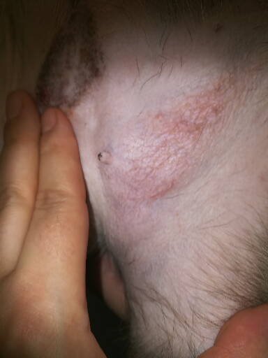 В результате минерализации подвергшихся дистрофии волокон эластина и коллагена кожи и ее придатков развивается дистрофический кальциноз10,24,25. Механизм развития этого процесса до конца не ясен. Клинически отложение солей кальция в коже выглядит как плотные на ощупь бляшки розового либо желтоватого цвета, часто воспаленные и с признаками инфицирования (рис. 6). Дистрофический кальциноз характерен именно для собак, у кошек подобного состояния не описано. Также исключительно у собак был отмечен редкий дерматоз, сопровождающийся формированием субэпидермальных булл. Поражения развились на вентральной поверхности тела в тех местах, где применялись местные кортикостероиды23. После отмены препаратов поражения исчезли.