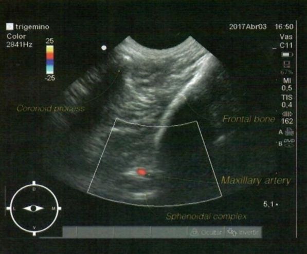 Тройничный нерв (trigeminal n.) обеспечивает сенсорную иннервацию областей, иннервируемых верхнечелюстным, нижнечелюстным и глазным нервами (в частности, лицевой отдел черепа, зубы, язык), а также иннервирует твердую мозговую оболочку6,7. Преимуществом применения блокады тройничного нерва является значительная площадь десенсибилизации: с помощью одной инъекции можно достичь анальгезии обширной зоны, охватывающей половину головы (рис. 17, 18). Процедура требует использования ультразвуковой навигации для визуализации сосудов и костных структур, что позволяет минимизировать риски и повысить точность проведения манипуляции (рис. 19, 21, 22)6.Техника проведения. Пальпаторно определяются анатомические ориентиры – скуловой отросток лобной кости, скуловая дуга и крылонёбная ямка. Место пункции – точка, располагающаяся в крылонёбной ямке каудально от скулового отростка лобной кости. УЗ-датчик размещается в височной области непосредственно за связкой орбиты; необходимо визуализировать каудальную часть крылонёбной ямки, латеральную часть лобной кости и крылонёбный узел (ганглий). После определения акустического окна необходимо активировать режим цветного доплера и определить верхнечелюстную артерию, которая выходит из крыловидного канала. Далее игла вводится параллельно датчику от медиальной плоскости в латеральном направлении, пока ее кончик не окажется около верхнечелюстной артерии; после проведения аспирационной пробы местный анестетик вводится выше и ниже местонахождения артерии6.
