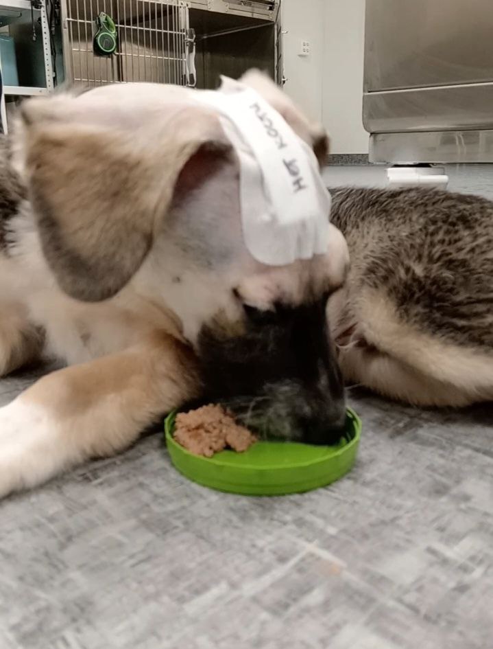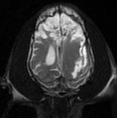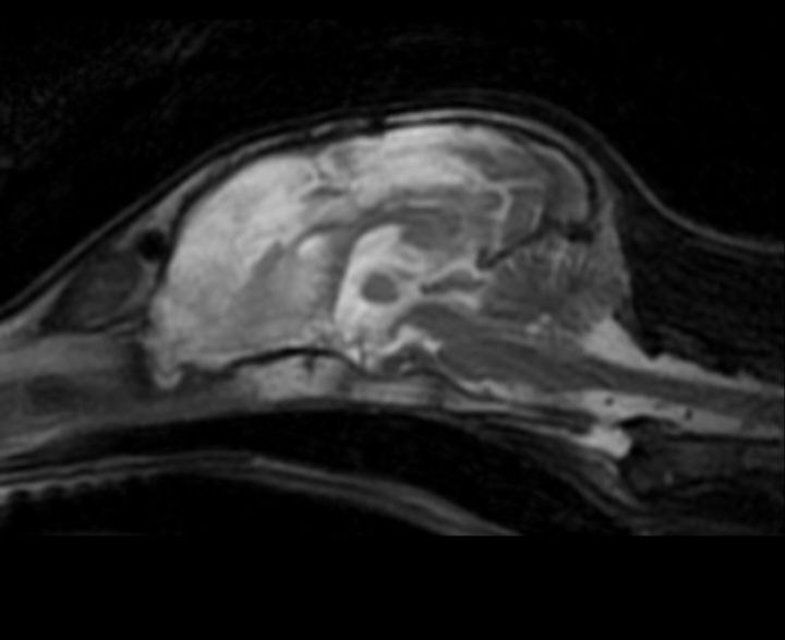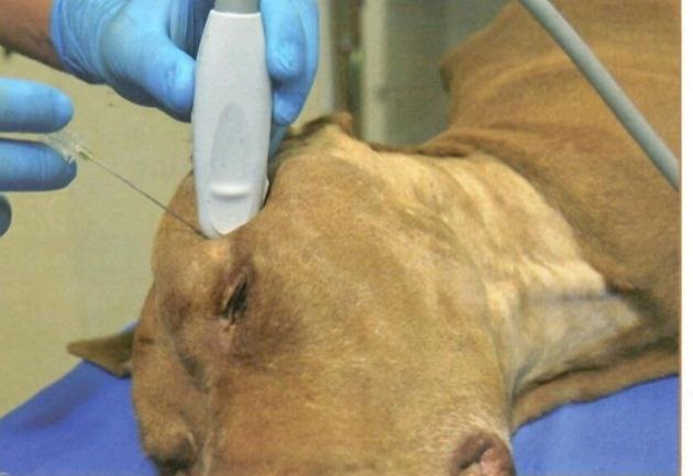 Пациент: 4-месячный щенок (метис). Субдуральная гематома, возникшая в результате закрытой черепно-мозговой травмы (ЗЧМТ). В данном случае с целью устранения гематомы и предотвращения дальнейшего сдавления мозговых структур была выполнена краниотомия.В связи с изменениями, опосредованными ЗЧМТ и смещением структур головного мозга вправо, возникла необходимость пересмотра плана проведения операции и возможного расширения хирургического доступа у данного пациента. Для обеспечения адекватной анальгезии пациента было принято решение о проведении блокады тройничного нерва (рис. 23, 24).