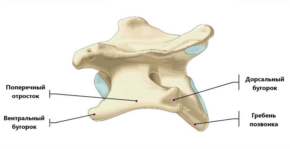 При анатомическом исследовании с окрашиванием нервных структур посредством проведения глубоких фасциальных инъекций для оценки распространения анестетика было выявлено, что прилегающая к поперечным отросткам длинная мышца головы (m. longus capitis) на уровне С3 (рядом с которой проходят спинномозговые нервы [СМН] С2-С3) начинает смещаться вентромедиально, и в области дорсального бугорка поперечного отростка третьего шейного позвонка (рис. 2) прикрепляется лестничная мышца (m. scalenus), к которой с дорсальной стороны подходит СМН С4. Далее нервы проходят поперечно по латеральной поверхности плечепоперечной мышцы (m. omotransversarius) и отдают кожные ветви от основных стволов, после чего направляются дорсально (рис. 3).