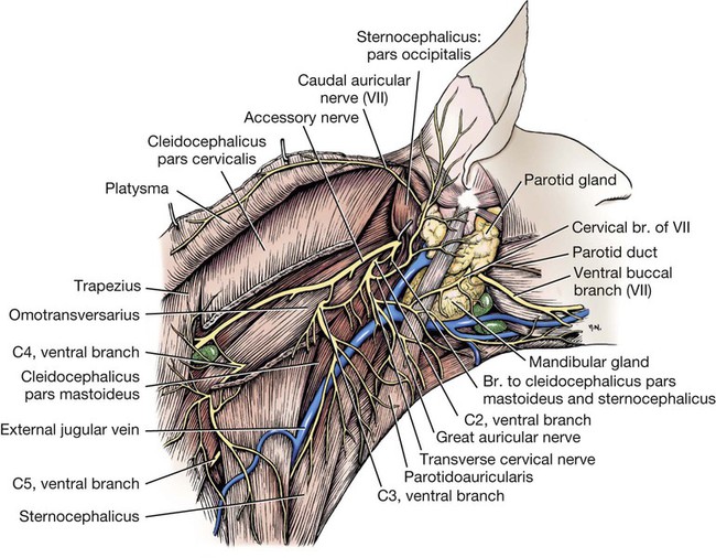 Рис. 3. Поверхностные нервы шеи: латеральная поверхность1.Иннервация шеи у животных осуществляется через спинномозговые нервы, которые выходят из межпозвоночных отверстий, формируя шейное сплетение (C1–C4) и плечевое сплетение (C5–T1). На 7 шейных позвонков приходится 8 пар спинномозговых нервов.