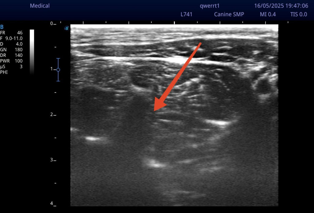 Для выполнения данной хирургической манипуляции, помимо общей анестезии, индуцированной пропофолом и поддерживаемой ингаляционной анестезией с помощью изофлурана, была проведена блокада лестничной мышцы под контролем УЗИ (видео 2). Техника выполнения блокады лестничной мышцы схожа с методикой блокады длинной мышцы головы за исключением необходимости идентифицировать четвертый шейный позвонок с краниальной его части, при этом целевой точкой будет вентральный бугорок поперечного отростка С4. Он визуализируется как акустическая тень от кортикального слоя вентрального бугорка, направленная перпендикулярно к поверхности сканирования. Над бугорком определяется структура, напоминающая «шапочку», которая является лестничной мышцей.