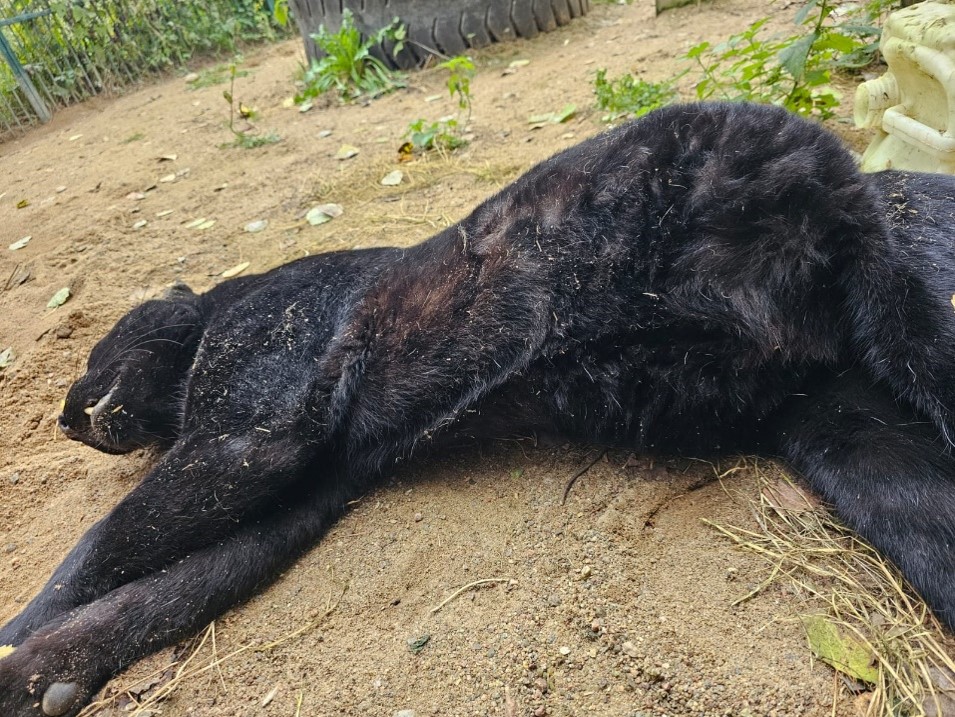 Самка леопарда-меланиста по кличке Панамера (фото 1) поступила в Хоспис для крупных кошек «Дом тигра» в возрасте 1 год 6 месяцев, была планово кастрирована (лапароскопическая овариоэктомия) и обследована. В ходе диагностики было исключено наличие хронических вирусных инфекций: вирусного иммунодефицита кошек (FIV) и вирусной лейкемии кошек (FeLV). Уровень IgG к вирусу иммунодефицита кошек составил 1,5, что соответствует отрицательному результату. Анализ на наличие ДНК провируса лейкоза (латентная инфекция) и РНК вируса лейкемии (активная инфекция) также дал отрицательный результат.Спустя 17 месяцев после поступления в хоспис Панамера была обнаружена мертвой в своем вольере. В период, предшествующий смерти, не наблюдалось ухудшения общего состояния животного. Анализ записей с камер видеонаблюдения не выявил факторов, которые могли бы способствовать наступлению летального исхода. Также не было зафиксировано длительного агонального периода. Труп леопарда находился в положении на правом боку, при этом наблюдалось значительное увеличение объема брюшной полости (фото 2А).