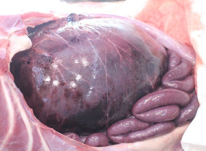 Селезенка смещена краниодорсально, располагалась у диафрагмы и печени, утолщена, темно-бордового цвета, а брыжейка кровенаполнена и сдавлена. Паренхима селезенки значительно утолщена, сильно кровенаполнена (фото 2Г).