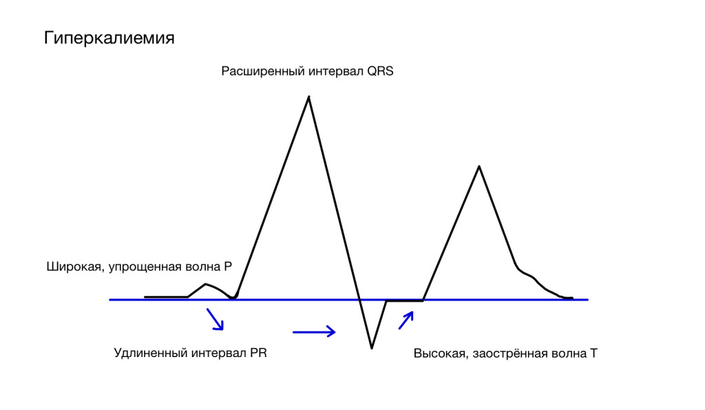 Если у пациента наблюдаются ЭКГ-признаки гиперкалиемии, рекомендуется немедленное вмешательство, а именно: медленное внутривенное (в течение 1–2 минут) введение кальция глюконата в дозе 100–150 мг/кг. Кардиопротективный эффект от введения кальция глюконата длится около 40–60 минут. При необходимости болюс можно повторить.