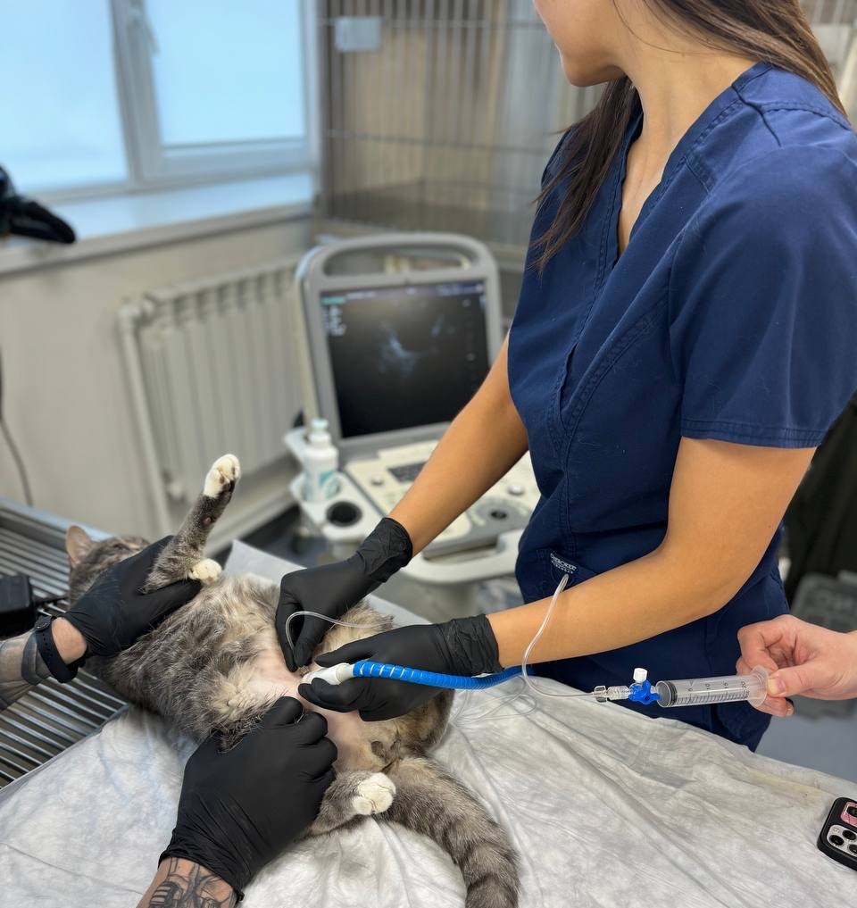 После первичной анальгезии следует устранить непосредственную причину болевого синдрома – перерастяжение стенок мочевого пузыря. Для этого рекомендовано выполнение декомпрессионного цистоцентеза с целью опорожнения мочевого пузыря и снижения давления в мочевыводящих путях, что приводит к облегчению болевого синдрома.