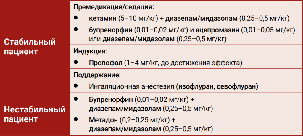 Выбор анестезиологического протокола осуществляется в зависимости от наличия в клинике наркотических средств и психотропных веществ, а также с учетом гемодинамического статуса пациента.