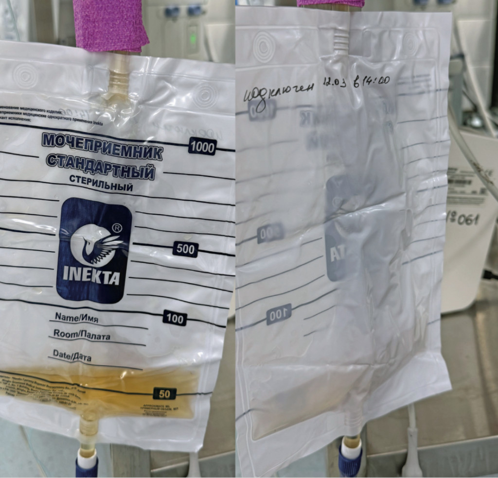 Сразу после стабилизации гемодинамических параметров параллельно с выполнением вышеописанных процедур рекомендовано проведение катетеризации уретры5,6,8. Цель установки уретрального катетера заключается в восстановлении и поддержании адекватного оттока мочи, а также подсчете темпа диуреза (рис. 5).