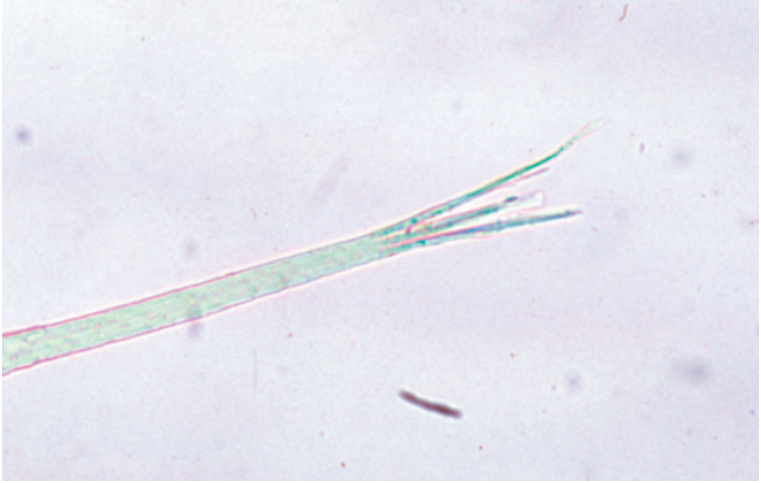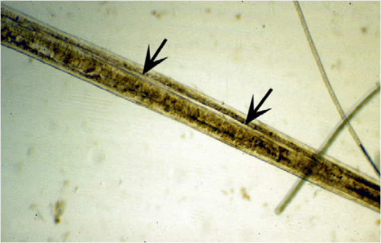 Медуллярная трихомаляция отмечалась у немецких овчарок, но неизвестно, является ли это заболевание приобретенным или врожденным. При медуллярной трихомаляции медулла волосяного стержня вакуолизирована (рис. 5), что приводит к повышенной хрупкости волоса1.