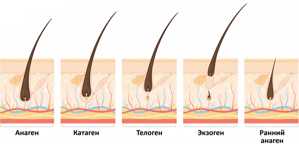 У большинства пород собак наблюдается асинхронная (мозаичная) смена шерсти с чередованием фаз анагена (в среднем 40% волосяных фолликулов), телогена (в среднем 17%) и кеногена (в среднем 14%), но у некоторых пород (например, у пуделей) волосяной покров состоит из анаген-доминирующих фолликулов, более 90% которых находятся в фазе активного роста2.