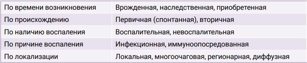 Алопеция (гипотрихоз) – распространенная причина обращения к ветеринарному врачу, и для выявления основного заболевания необходимо провести системное обследование. Из-за различий в толщине и длине волос в зависимости от породы, плотности размещения волосяных фолликулов и сезонных изменений клиническая оценка легкого гипотрихоза может быть затруднена. При осмотре шерстного покрова необходимо учитывать множество факторов для точной диагностики и эффективного лечения. Алопеции классифицируют в зависимости от времени возникновения, причины, локализации, наличия воспаления и инфекции (табл. 1).