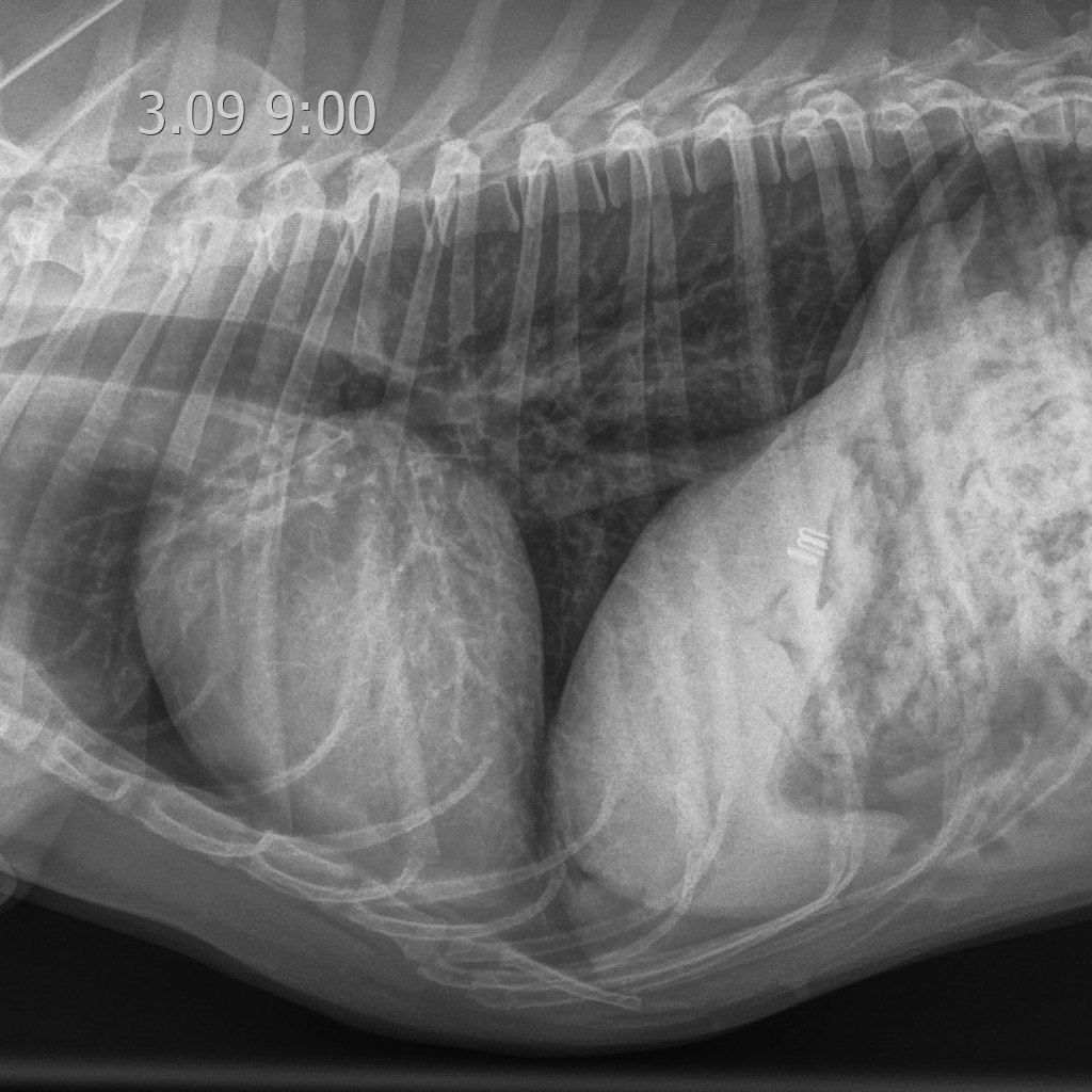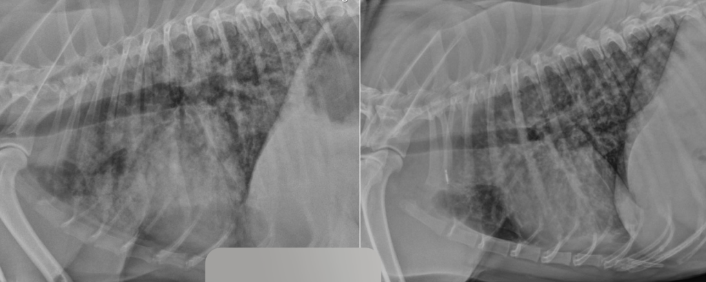 На пятые сутки, спустя двое суток после операции, общее состояние пациента и результаты анализов крови улучшились, активность увеличилась, собака стала более эмоциональной, но самостоятельный аппетит по-прежнему отсутствовал. Диарея не наблюдалась, жажда и мочеиспускание оставались без особенностей. Болезненность брюшной стенки оценивалась как легкая. Были отменены мультимодальная анальгезия, поддерживающая инфузионная терапия и смекта. Однако появились новые симптомы: кашель и увеличение частоты дыхательных движений во сне до 30 дых. дв./мин, без признаков диспноэ. Уровень насыщения крови кислородом (SpO2) без дополнительной оксигенотерапии составлял 93–95%. При рентгенологическом исследовании были выявлены преимущественно диффузные альвеолярные затемнения легочной ткани, охватывающие почти все поля легких. Наибольшая площадь поражения наблюдалась в каудальных долях обоих легких (рис. 9). Данные изменения в совокупности с установленным диагнозом указывали на высокую вероятность геморрагий в легочной паренхиме как одного из проявлений лептоспироза.